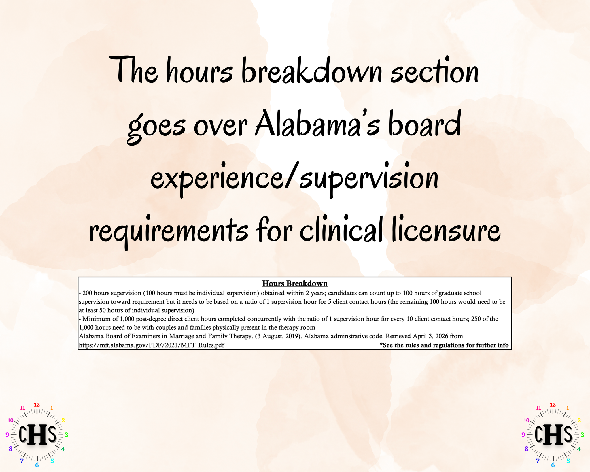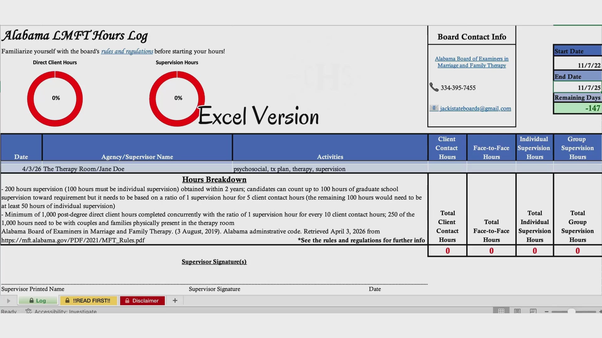 Use this clinical hours tracker and easily start recording your hours towards becoming a Licensed Marriage and Family Therapist in ALABAMA! This supervision template is completely custom AND requirement compliant with the state counseling board rules and regulations! Use Microsoft Excel and/or Google Sheets to easily log your daily LMFT hours and activities! Begin your clinical supervision with ease and watch as you accrue your licensure hours and get closer towards your dreams! This spreadsheet saves you time and makes gaining your clinical hours FUN! If you are currently an Alabama Marriage and Family Therapist Associate or a therapy student with an upcoming graduation and aspire to become an Alabama LMFT – make sure you check this out! *Spreadsheet last updated April 2026*