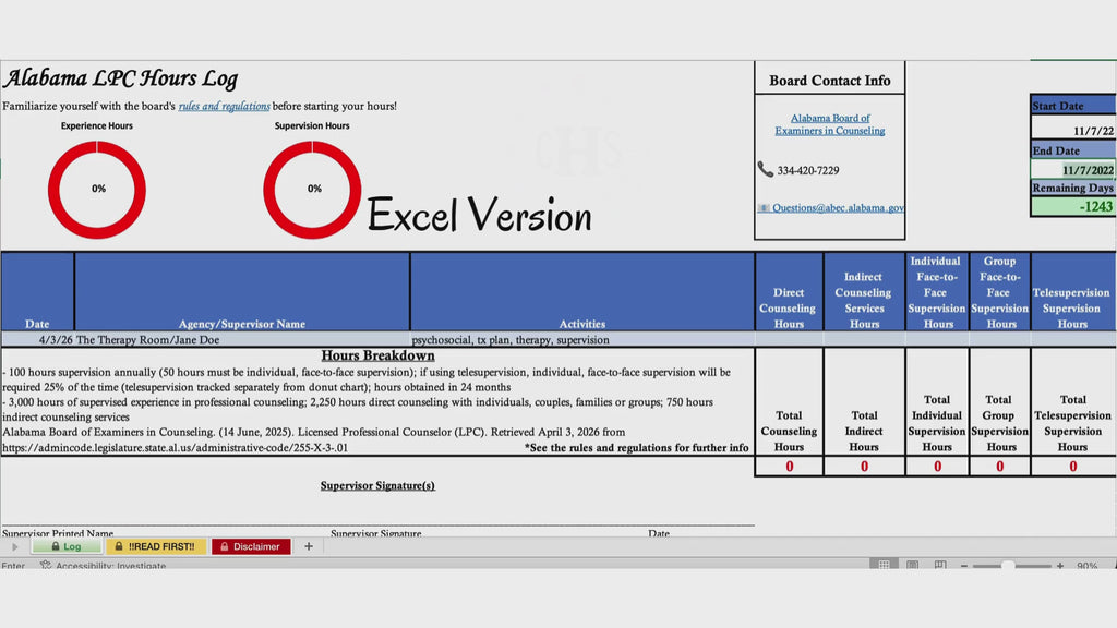 Use this clinical hours tracker and easily start recording your hours towards becoming a Licensed Professional Counselor in ALABAMA! This supervision template is completely custom AND requirement compliant with the state counseling board rules and regulations! Use Microsoft Excel and/or Google Sheets to easily log your daily LPC hours and activities! Begin your clinical supervision with ease and watch as you accrue your licensure hours and get closer towards your dreams! This spreadsheet saves you time and makes gaining your clinical hours FUN! If you currently have your Alabama ALC or are a counseling student with an upcoming graduation and aspire to become an Alabama LPC – make sure you check this out! *Spreadsheet last updated April 2026*