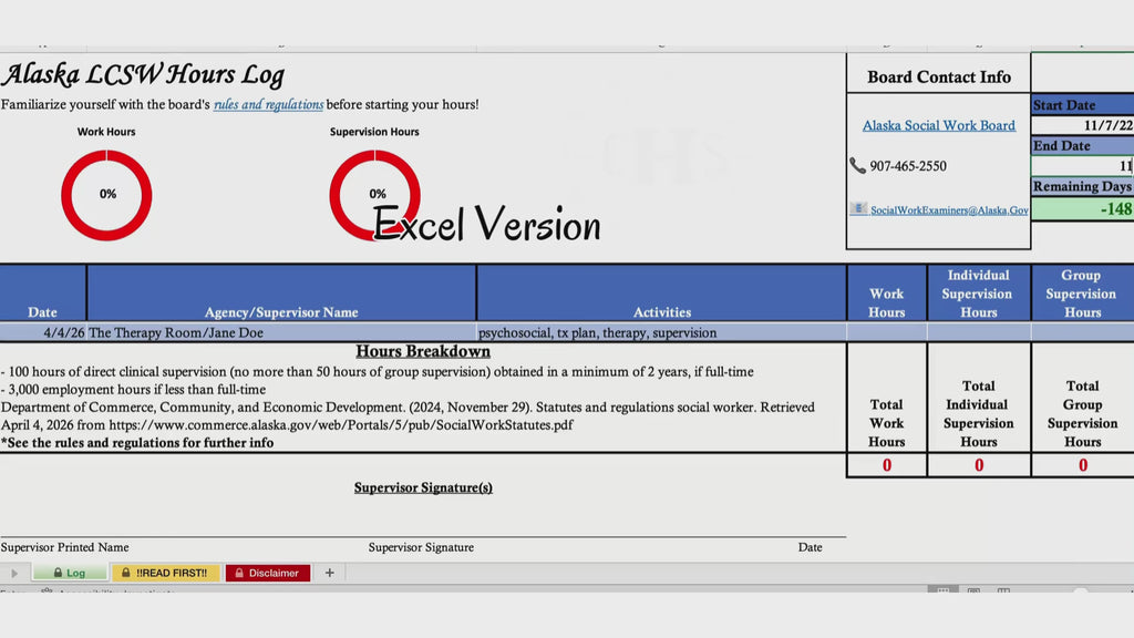 Use this clinical hours tracker and easily start recording your hours towards becoming a Licensed Clinical Social Worker in ALASKA! This supervision template is completely custom AND requirement compliant with the state social work board rules and regulations! Use Microsoft Excel and/or Google Sheets to easily log your daily LCSW hours and activities! Begin your clinical supervision with ease and watch as you accrue your licensure hours and get closer towards your dreams! This spreadsheet saves you time and makes gaining your clinical hours FUN! If you currently have your Alaska LMSW or are a social work student with an upcoming graduation and aspire to become an Alaska LCSW – make sure you check this out! *Spreadsheet last updated April 2026*