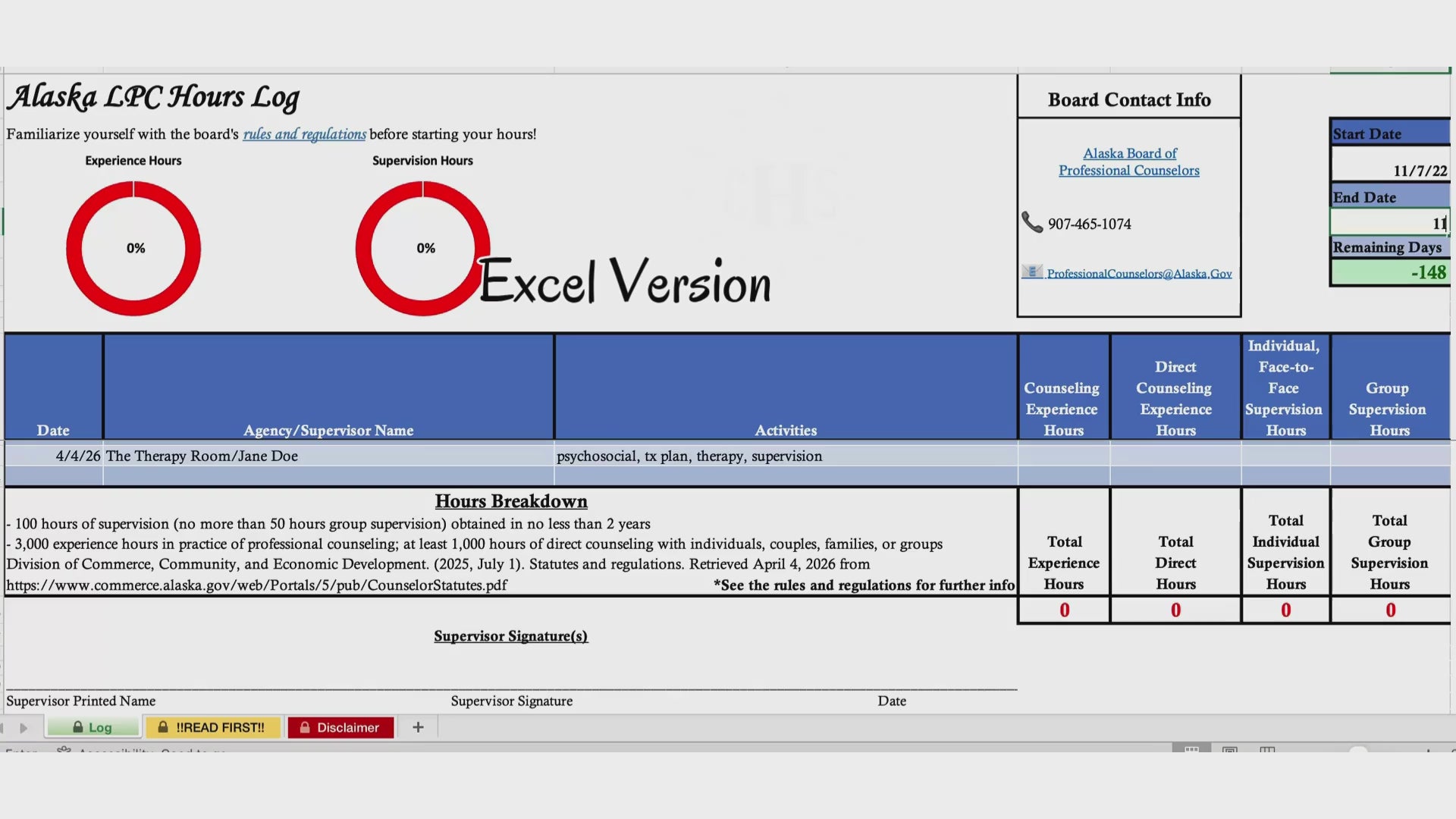 Use this clinical hours tracker and easily start recording your hours towards becoming a Licensed Professional Counselor in ALASKA! This supervision template is completely custom AND requirement compliant with the state counseling board rules and regulations! Use Microsoft Excel and/or Google Sheets to easily log your daily LPC hours and activities! Begin your clinical supervision with ease and watch as you accrue your licensure hours and get closer towards your dreams! This spreadsheet saves you time and makes gaining your clinical hours FUN! If you are in Alaska, have your master's degree in counseling or are a counseling student with an upcoming graduation and aspire to become an Alaska LPC – make sure you check this out! *Spreadsheet last updated April 2026*