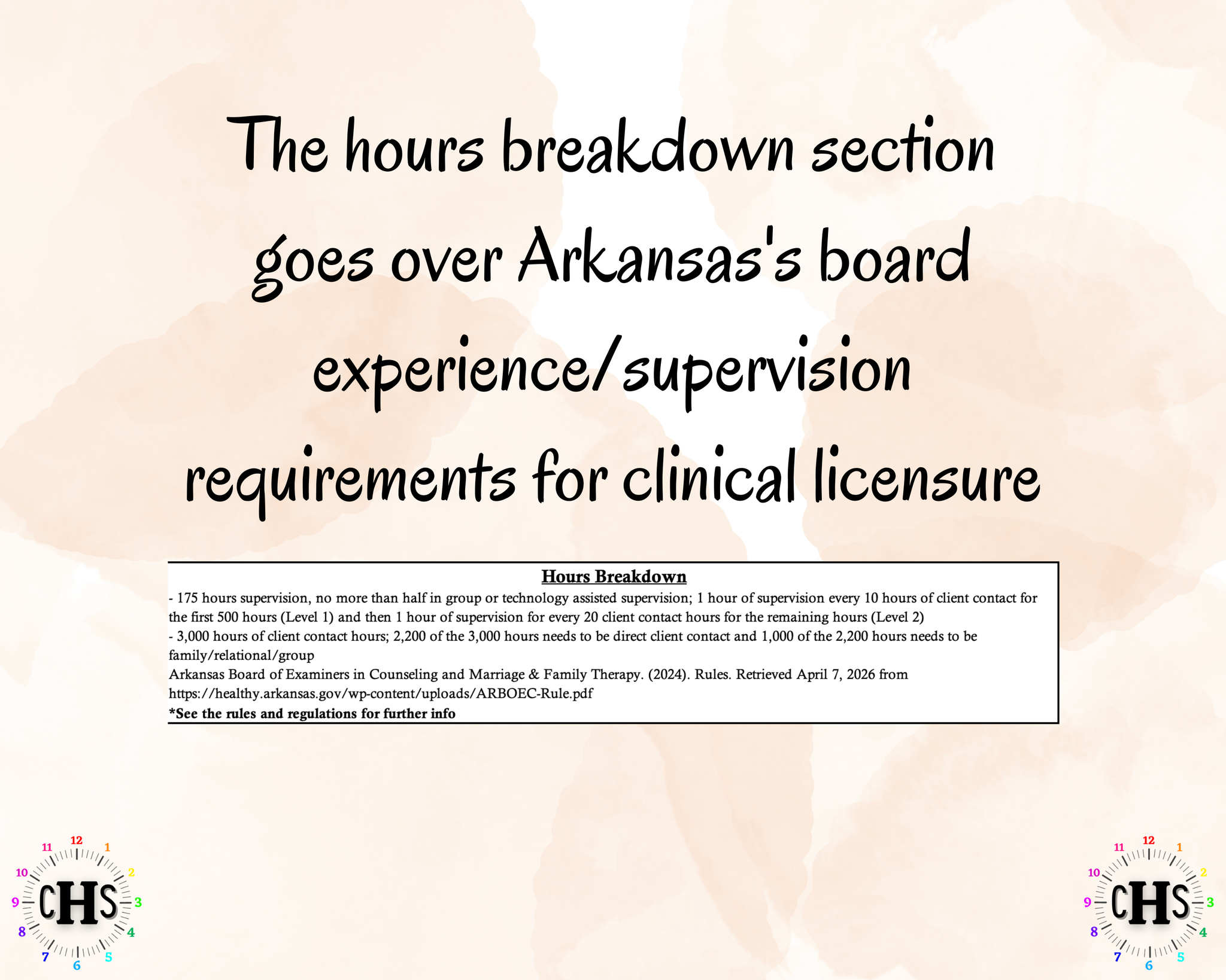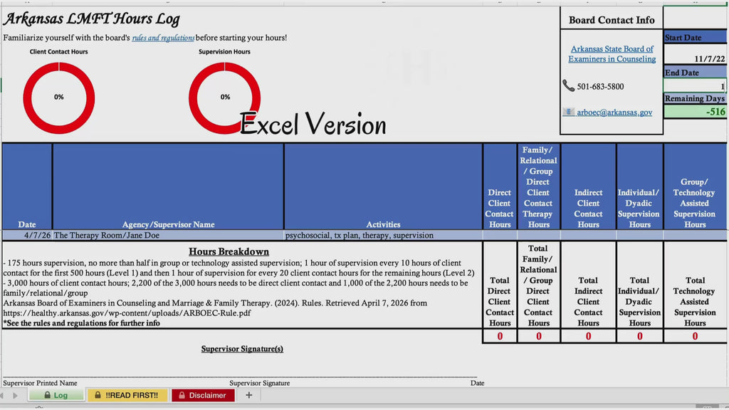 Use this clinical hours tracker and easily start recording your hours towards becoming a Licensed Marriage and Family Therapist in ARKANSAS! This supervision template is completely custom AND requirement compliant with the state counseling board rules and regulations! Use Microsoft Excel and/or Google Sheets to easily log your daily LMFT hours and activities! Begin your clinical supervision with ease and watch as you accrue your licensure hours and get closer towards your dreams! This spreadsheet saves you time and makes gaining your clinical hours FUN! If you currently have your Arkansas LAMFT or are a therapy student with an upcoming graduation and aspire to become an Arkansas LMFT – make sure you check this out! *Spreadsheet last updated April 2026*