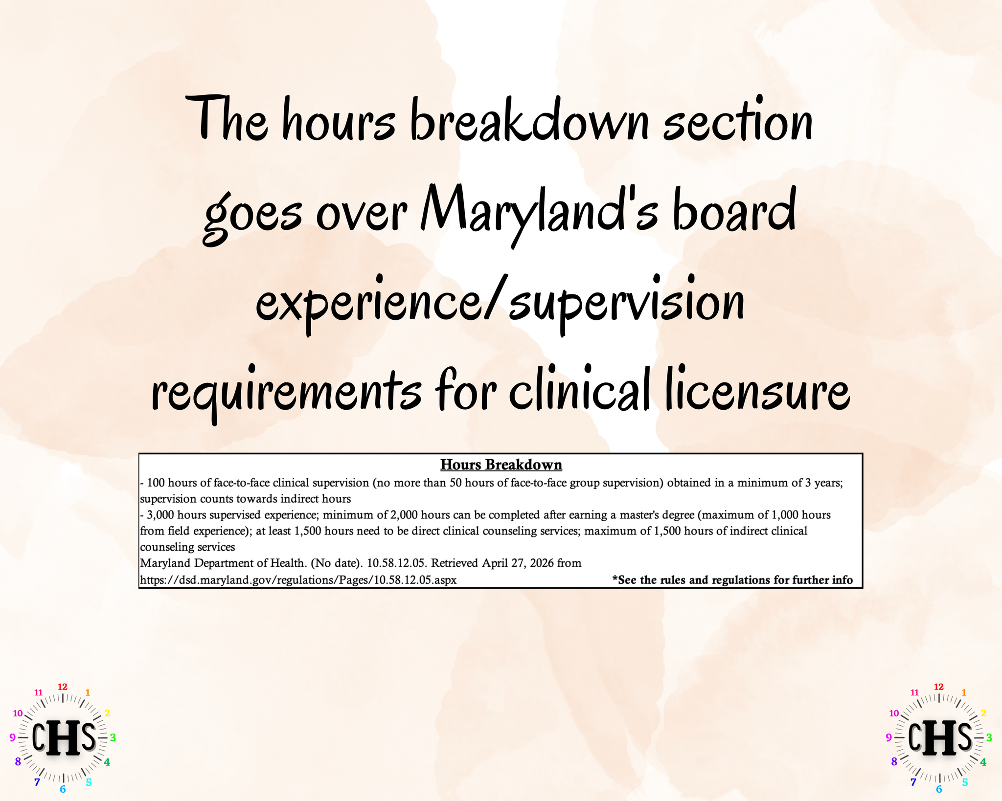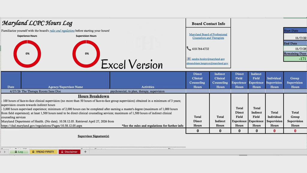 Use this clinical hours tracker and easily start recording your hours towards becoming a Licensed Clinical Professional Counselor in MARYLAND! This supervision template is completely custom AND requirement compliant with the state counseling board rules and regulations! Use Microsoft Excel and/or Google Sheets to easily log your daily LCPC hours and activities! Begin your clinical supervision with ease and watch as you accrue your licensure hours and get closer towards your dreams! This spreadsheet saves you time and makes gaining your clinical hours FUN! If you are currently a Maryland LCPC intern or are a counseling student with an upcoming graduation and aspire to become a Maryland LCPC – make sure you check this out! *Spreadsheet last updated April 2026*