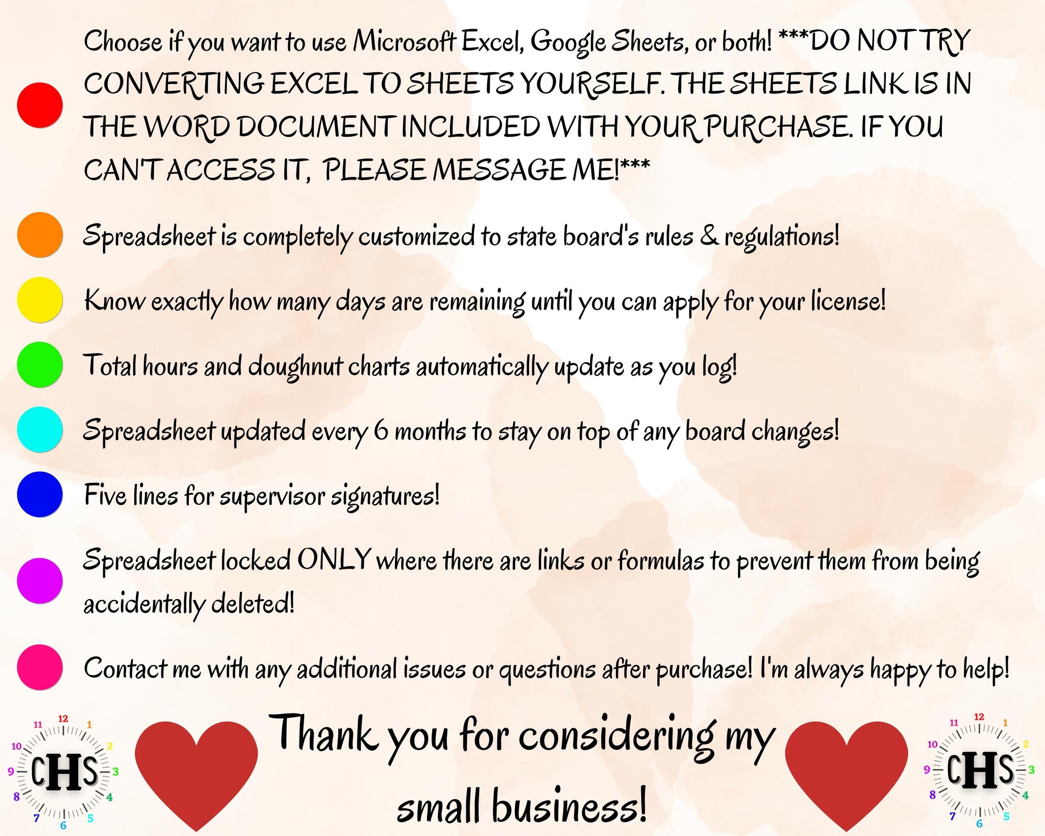 ✓ A completely customized Microsoft Excel and Google Sheets spreadsheet with hours and requirements preloaded so you can start logging immediately