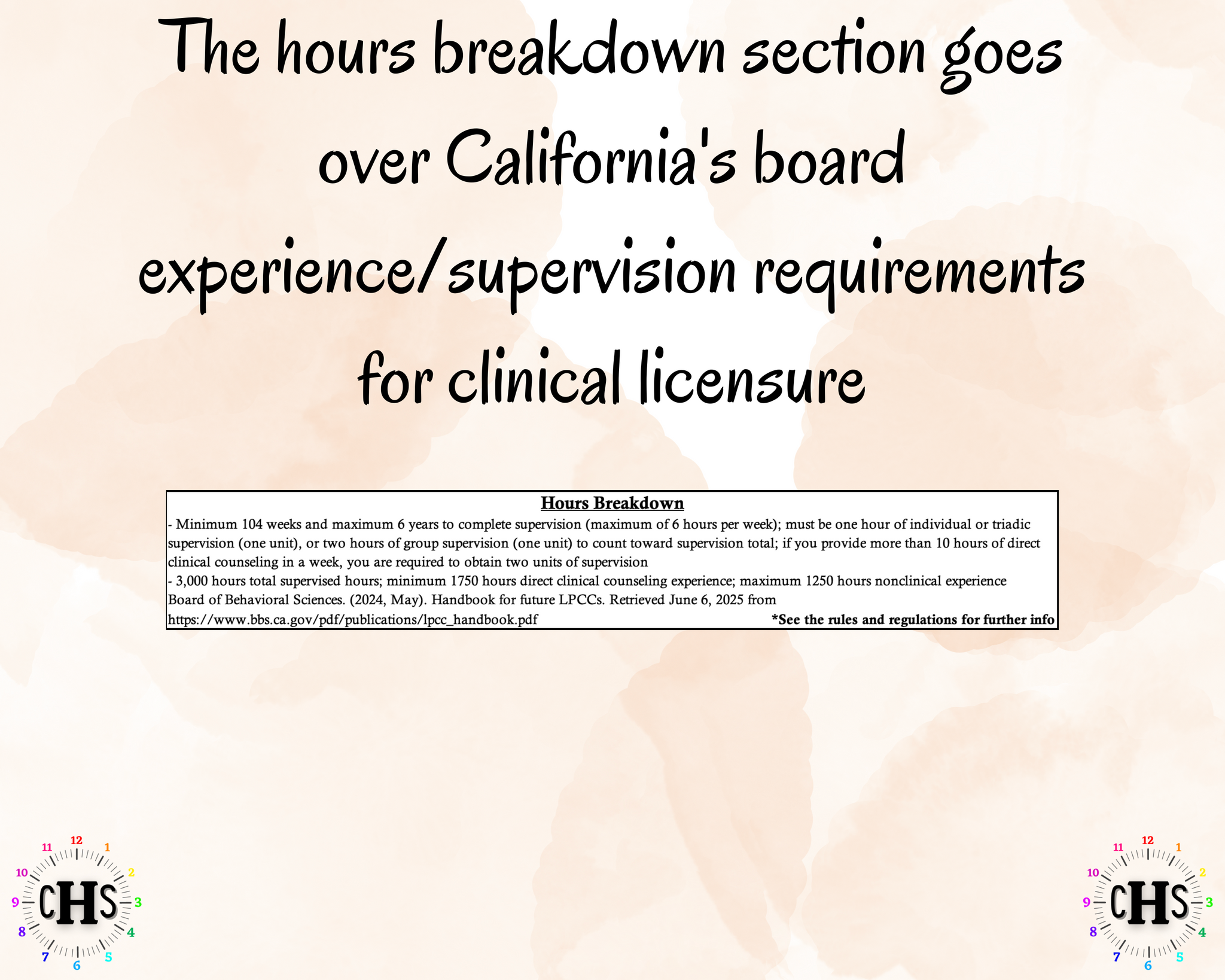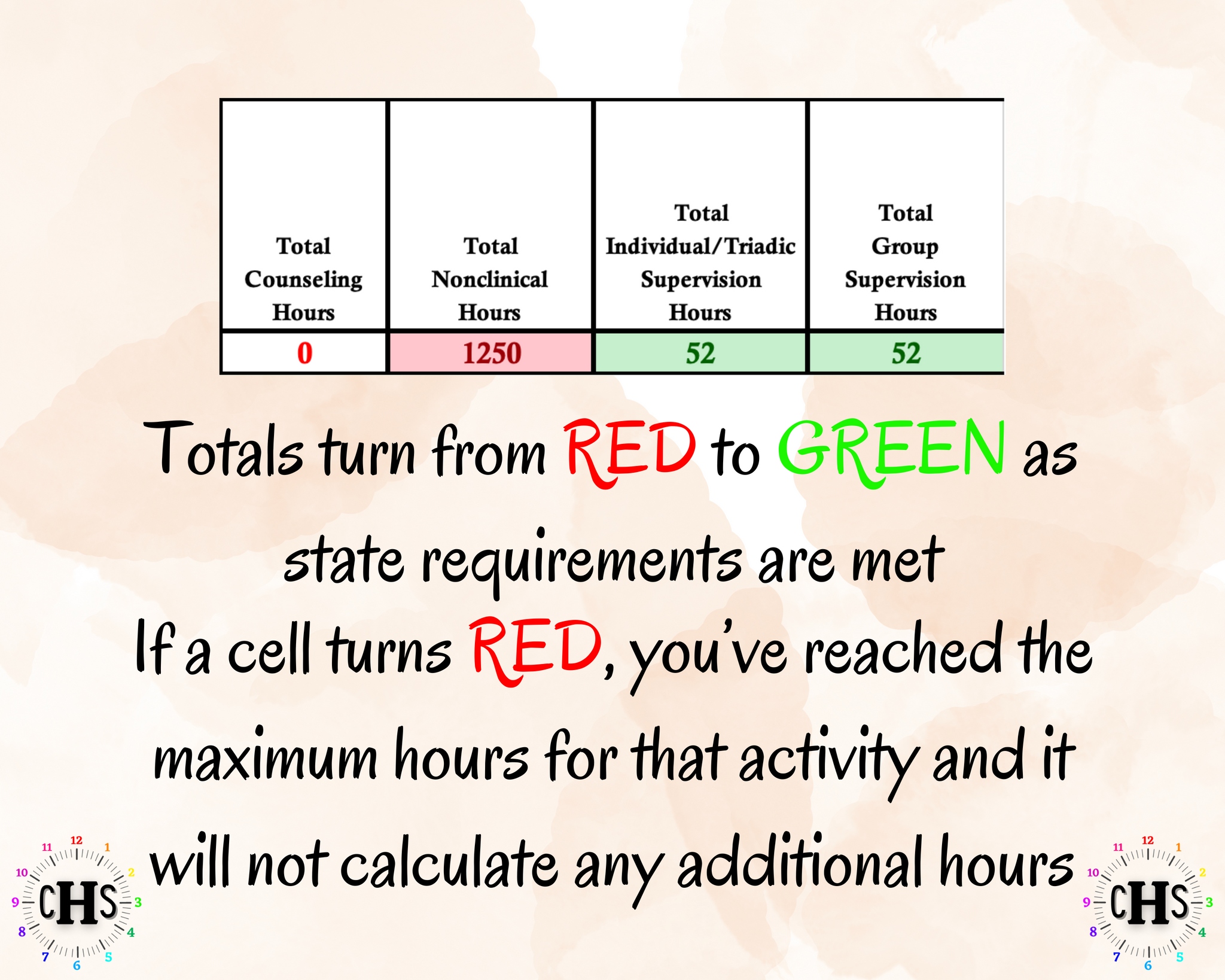 Use this clinical hours tracker and easily start recording your hours towards becoming a Licensed Professional Clinical Counselor in CALIFORNIA! This supervision template is completely custom AND requirement compliant with the state counseling board rules and regulations! Use Microsoft Excel and/or Google Sheets to easily log your daily LPCC hours and activities! Begin your clinical supervision with ease and watch as you accrue your licensure hours and get closer towards your dreams! This spreadsheet saves you time and makes gaining your clinical hours FUN! If you currently have your California APCC or are a counseling student with an upcoming graduation and aspire to become an California LPCC – make sure you check this out! *Spreadsheet last updated June 2025*