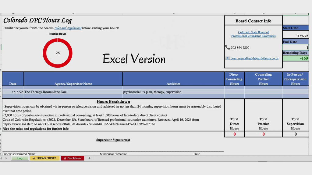 Use this clinical hours tracker and easily start recording your hours towards becoming a Licensed Professional Counselor in COLORADO! This supervision template is completely custom AND requirement compliant with the state counseling board rules and regulations! Use Microsoft Excel and/or Google Sheets to easily log your daily LPC hours and activities! Begin your clinical supervision with ease and watch as you accrue your licensure hours and get closer towards your dreams! This spreadsheet saves you time and makes gaining your clinical hours FUN! If you currently have your Colorado LPCC or are a counseling student with an upcoming graduation and aspire to become a Colorado LPC – make sure you check this out! *Spreadsheet last updated April 2026*