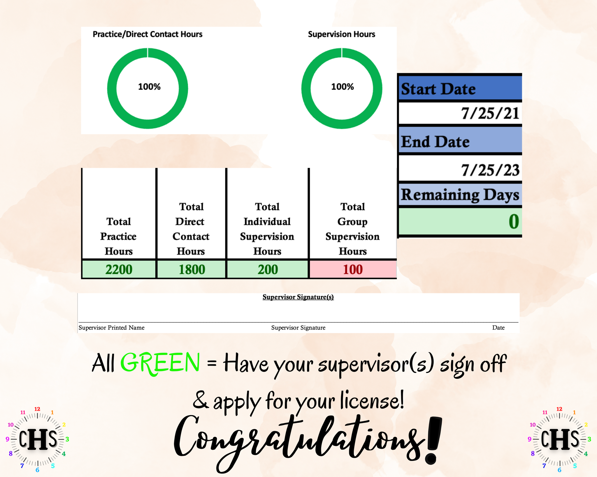 ✓ After purchase, you can instantly download your Microsoft Excel and Google Sheets spreadsheets and start counting your hours to get that brand new, shiny clinical license!
