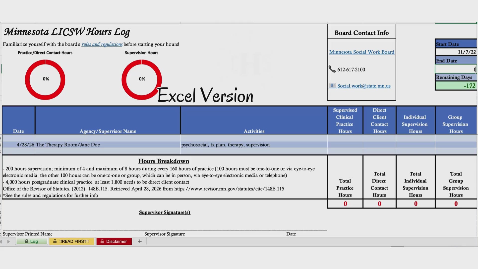 Use this clinical hours tracker and easily start recording your hours towards becoming a Licensed Independent Clinical Social Worker in MINNESOTA! This supervision template is completely custom AND requirement compliant with the state social work board rules and regulations! Use Microsoft Excel and/or Google Sheets to easily log your daily LICSW hours and activities! Begin your clinical supervision with ease and watch as you accrue your licensure hours and get closer towards your dreams! This spreadsheet saves you time and makes gaining your clinical hours FUN! If you currently have your Minnesota LISW or are a social work student with an upcoming graduation and aspire to become a Minnesota LICSW – make sure you check this out! *Spreadsheet last updated April 2026*